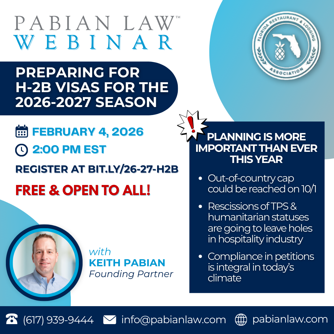 Attention winter-season hospitality employers! You are invited to join FRLA partner, Pabian Law, for their annual H-2B visa planning webinar, designed to help you prepare for what lies ahead with your winter 2026–2027 H-2B visa petitions. Attorney Keith Pabian will share practical guidance, timely insights, and strategic planning tips to help you navigate the H-2B visa process with confidence—particularly in light of increasing demand and the growing likelihood that the H-2B numerical cap will be reached for October 1st start dates. The webinar will also address the impact on the hospitality industry of recent terminations of humanitarian programs, including Temporary Protected Status (TPS), and what these changes may mean for your workforce planning. This webinar is essential for winter-season properties—those busier in the fall, winter, and spring than in the summer—who are considering H-2B visas as a staffing solution and want to ensure they are fully prepared for the upcoming season. With work beginning as early as mid-March, attending this webinar will help you hit the ground running and stay ahead of critical deadlines.