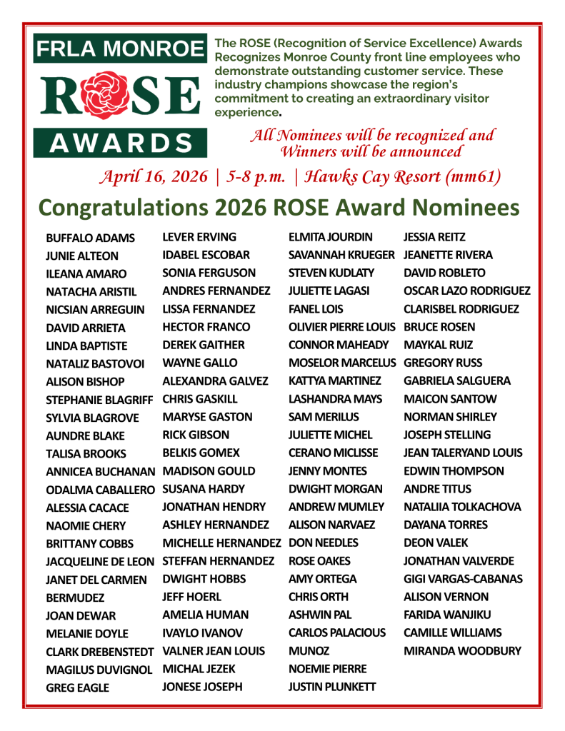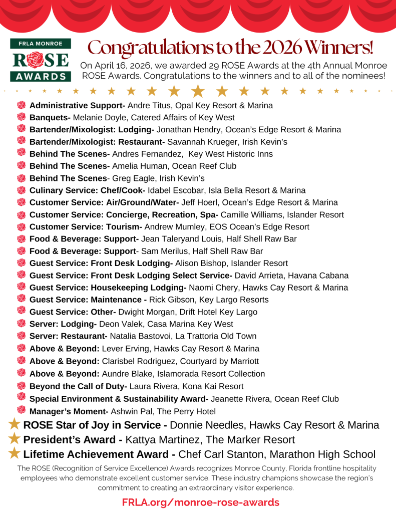 The ROSE (Recognition of Service Excellence) Awards recognizes Monroe County frontline hospitality employees who demonstrate excellent customer service. These industry champions showcase the region’s commitment to creating an extraordinary visitor experience.