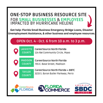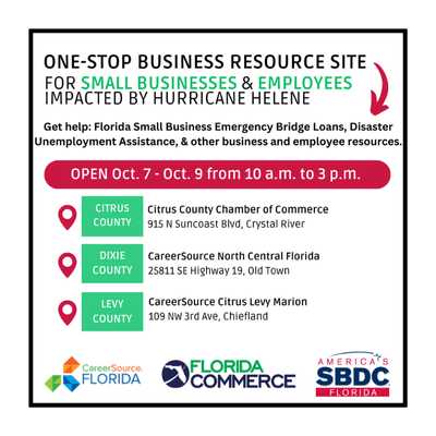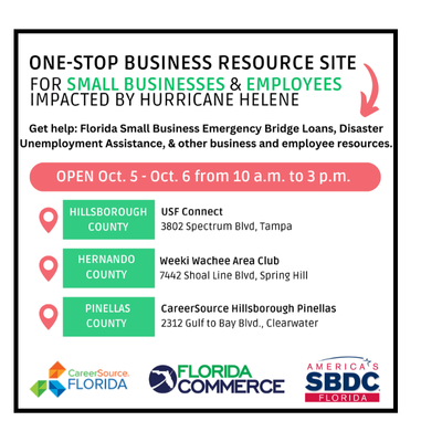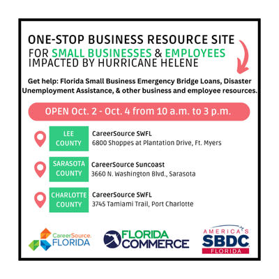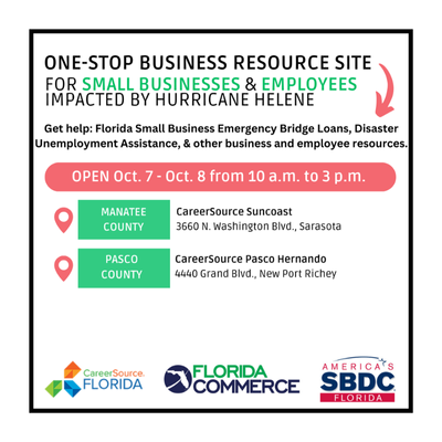 From Oct.1 – 9, FloridaCommerce is partnering with the Florida Small Business Development Center Network and CareerSource Florida to bring One-Stop Business Resource Sites to 17 counties impacted by Hurricane Helene. These sites provide support and resources to businesses and employees impacted by the storm. See the dates and locations below.